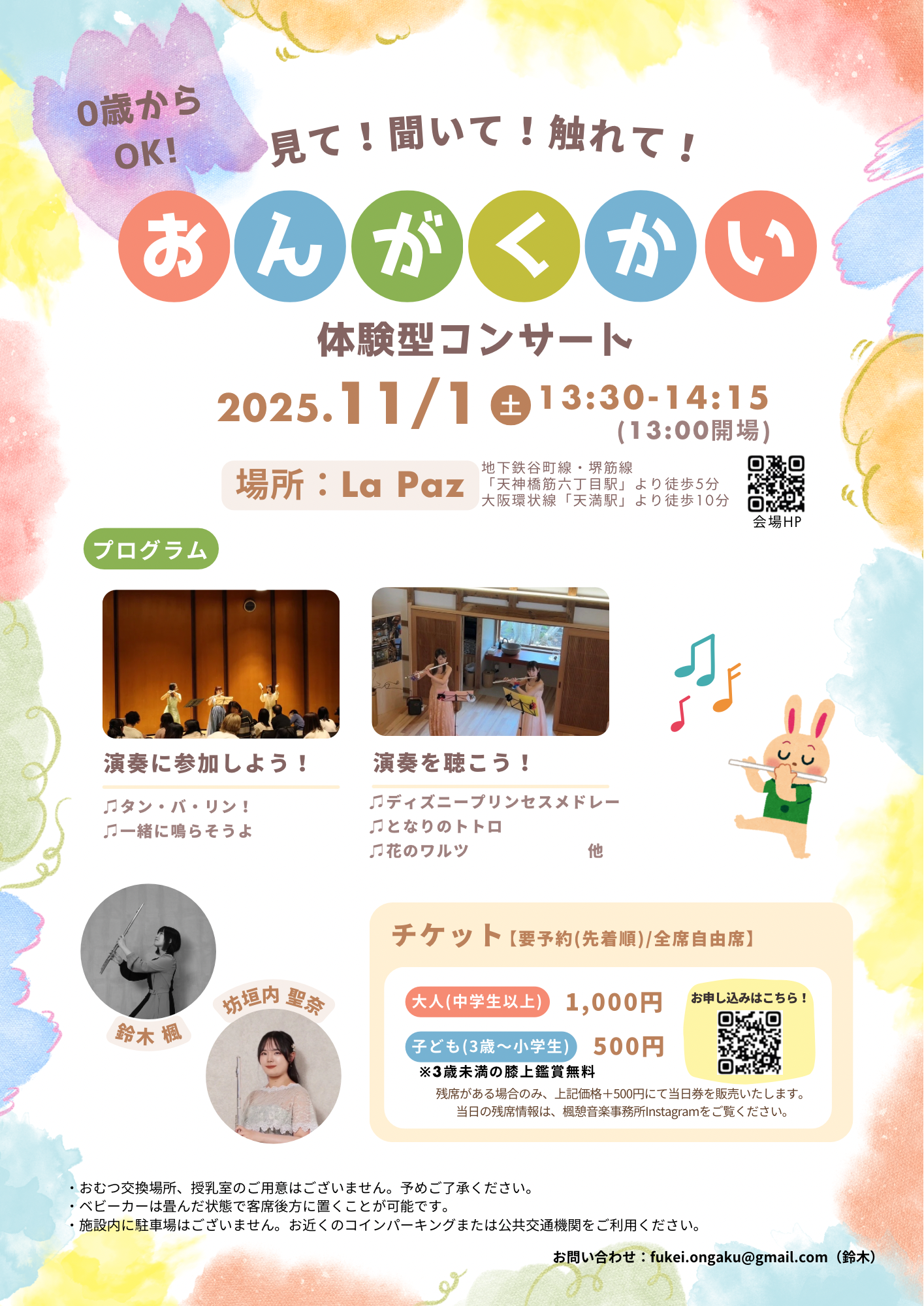 おんがくかい〜体験型コンサート〜 2025 10/05 コンサート 開催日 2025/11/01 時間 開場:13:00開演:13:30終演予定:14:15 会場 La Paz 「天神橋筋六丁目駅」より徒歩5分または 「天満駅」より徒歩10分 入場料 1000円以内 大人(中学生以上)1,000円 子ども(3歳〜小学生)500円 ※3歳未満の膝上観賞無料 公式サイト こちらのフォームよりお申込みください 楓憩さま公式Instagramはこちら 出演者からのコメント 0歳から参加OKです!Share on FacebookPost on XShare via mail コンサート